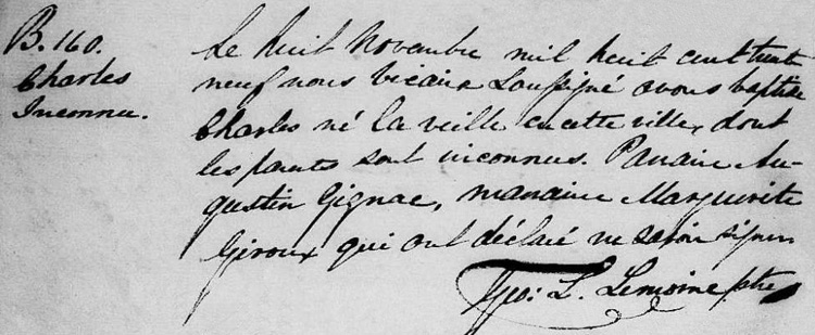 Record indicating Charles Inconnu (Unknown) birth and baptism record