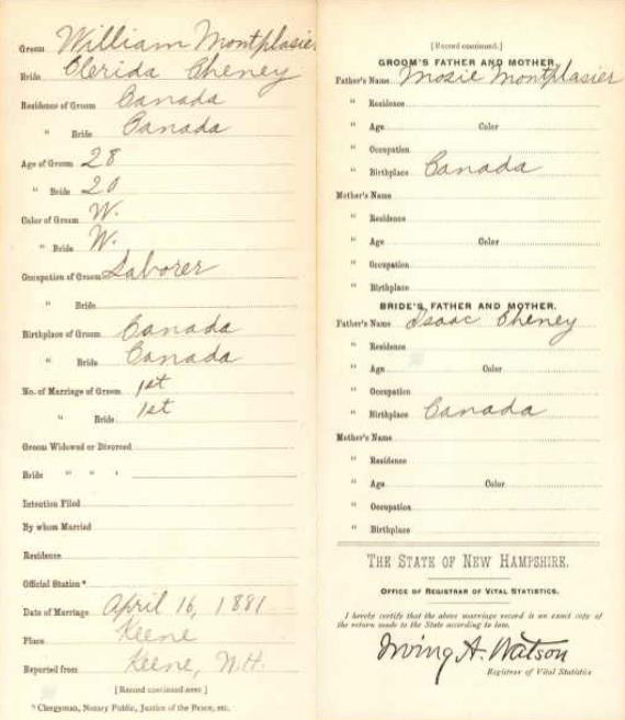 Marriage record between Clrida Cheney and Guillaume (William) Montplaisir