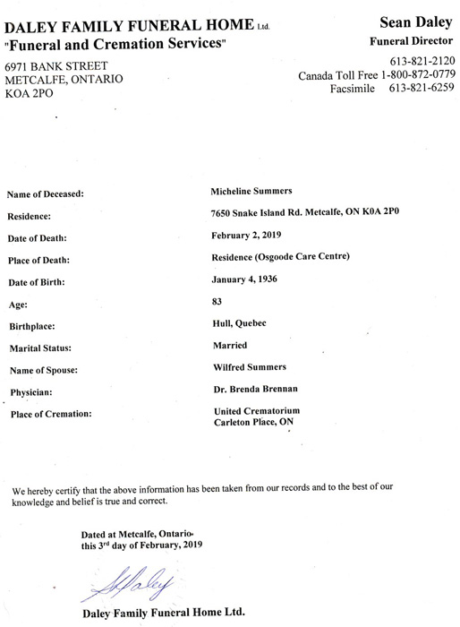 Acte de décès Micheline Summers (Née Pharand) (1936-2019)