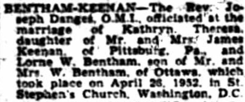 Copy of Newspaper article of marriage record between Lorne William Bentham & Kathryn Theresa Keenan