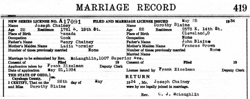 Record du marriage entre Joseph Chainey & Dorothy Blaine
