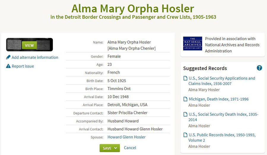 Preuve de mariage entre Alma Chénier et Howard Glenn Hosler