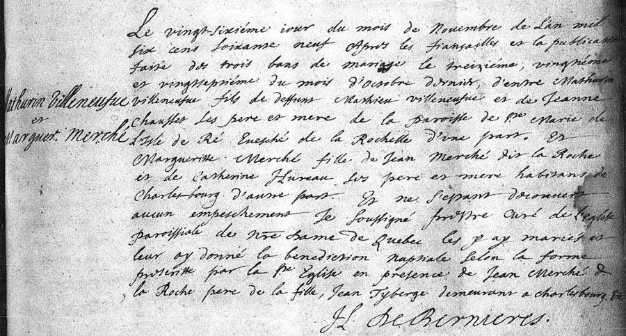 Marriage record between Mathurin Villeneuve and Marguerite Merché/Lemarché