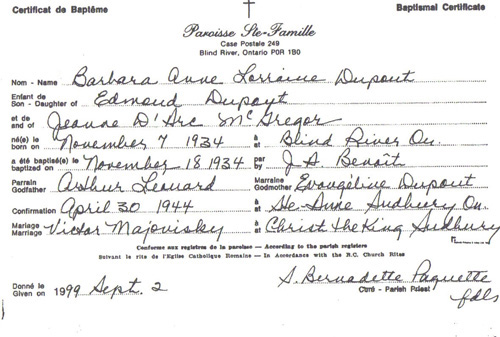 Barbara Anne Lorraine Dupont (Record de baptême)