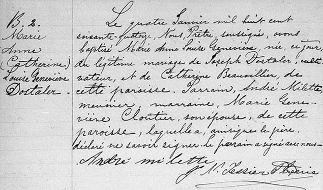 Baptism record for Marie Anne Catherine Louise Geneviève Dostaler