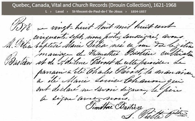 Birth & baptism record for Marie Délia Bastien (Cordélia Rocan)
