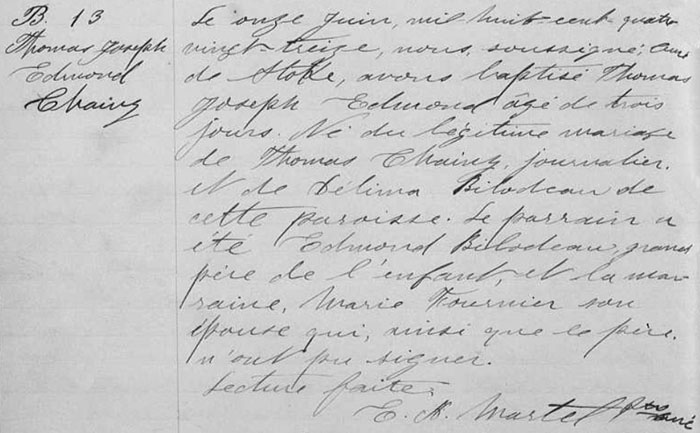 Record de naissanse et baptême pour Thomas Joseph Edmond Chainey