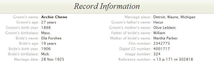 Record de mariage enter Achille (Archie) Chéné et Ella Forshee
