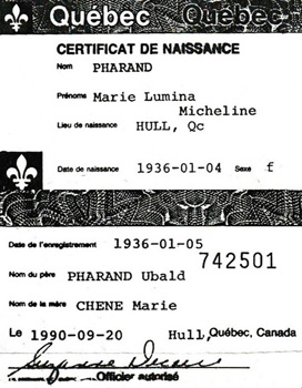Acte de naissance au Québec de Marie Lumina Micheline Pharand