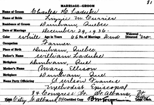Record of second marriage of Joséphine Onésime (Lizzie) Chesney to Charles Laduke/Leduc