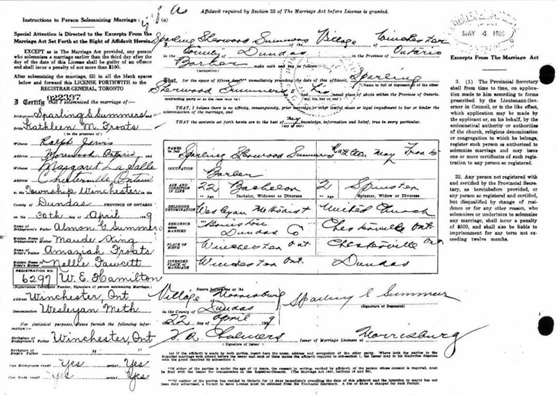 Acte de mariage entre Sparling Sherwood Summers et Katheline Mabel "May" Froats