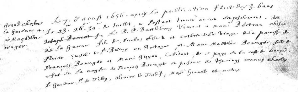Marriage record between Bertrand Chesnay Dit Lagarenne & Marie Madeleine Bellanger